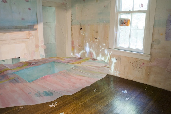 As part of Everything’s New All the Time, a collaboration with artists Shilpi Gupta and Clint Coburn, we transformed my studio into an otherworldly space with mystical creatures, pools and springtime blossoms. My own painted footprints led the way for the viewer into a watercolor panorama covering the walls. Members of the public, encouraged by sidewalk signage, attended this exhibition during a city-wide gallery event.